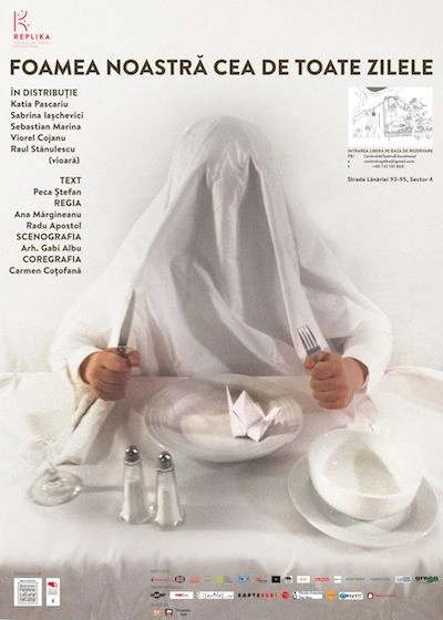 “Public si artisti re-creeaza impreuna, in cadrul unui spectacol-cina, unul dintre proiectele filantropului roman Septimiu Bazilescu Ariston de a vindeca “foamea noastra cea de toate zilele”. Avand la baza cateva insemnari incomplete ale filantropului, gasite in documentare, dar si o serie de interviuri cu oameni care si-au pierdut casele in Sectorul 4 din Bucuresti, Foamea noastra cea de toate zilele creeaza o experienta imersiva care isi propune sa exploreze natura saraciei din Romania, relatia dintre schimbare sociala reala si procesul artistic, conflictul dintre realitate si fictiune si felul in care il consumam in timpul participarii la un spectacol.” Peca Stefan