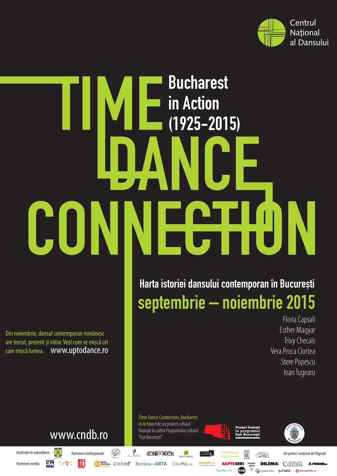 Time Dance Connection. Bucharest in Action (1925-2015) - Harta istoriei dansului contemporan în București este un proiect cultural finanţat în cadrul Programului cultural ”Ești București” al Centrului de Proiecte Culturale al Municipiului București – ARCUB și al Primăriei Municipiului București.