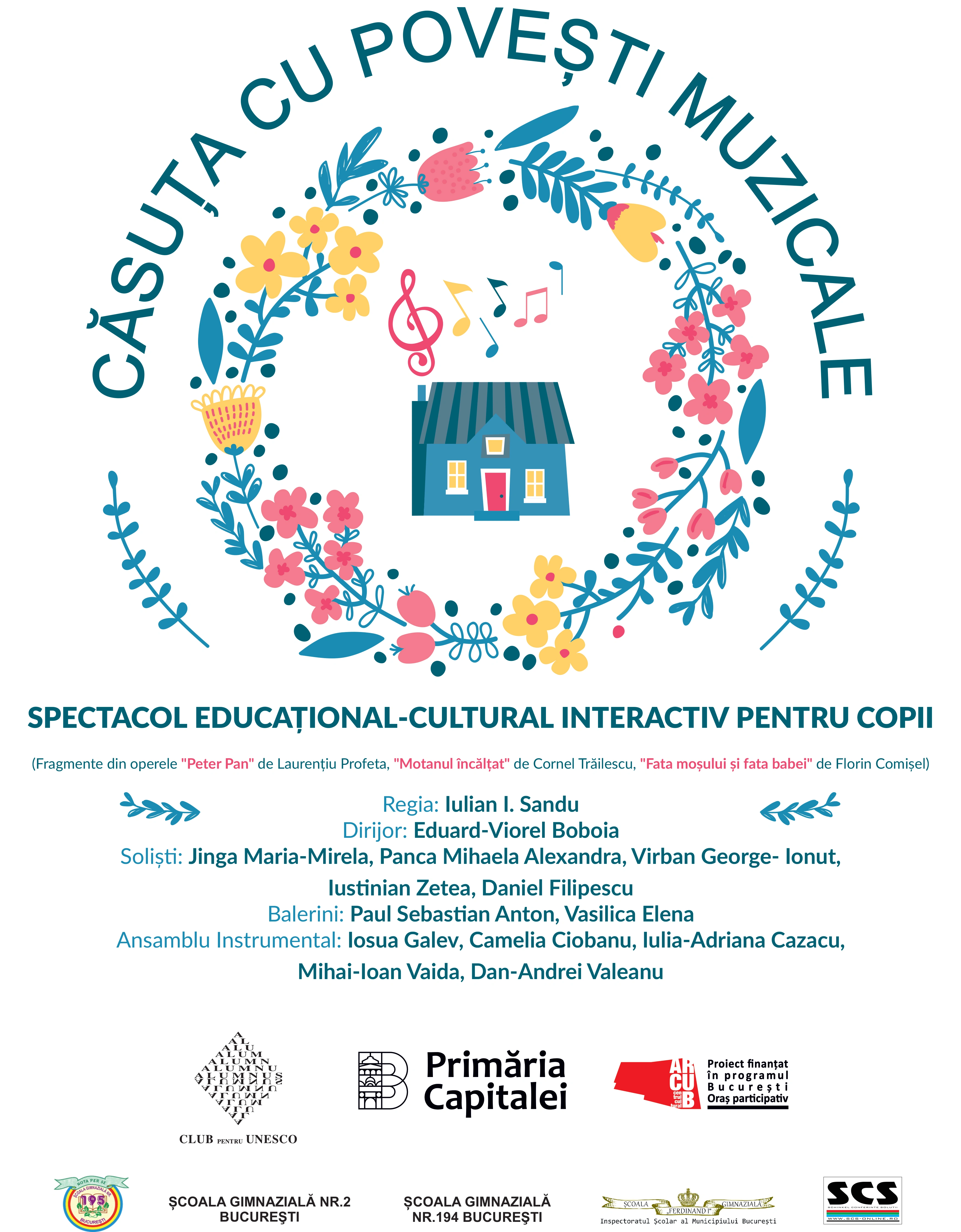 In luna octombrie, spectacolul educational-cultural interactiv pentru copii “Casuta cu Povesti Muzicale” se va desfasura in Bucuresti in cadrul Scolii Gimnaziale “Ferdinand I”, Scolii Gimnaziale numarul 2, Scolii Gimnaziale numarul 194 si Scolii Gimnaziale numarul 195. Spectacolul reprezinta o oportunitate unica pentru elevii claselor 0-4 de a se bucura in cadrul scolilor lor de un spectacol muzical de opera exceptional, special creat pentru ei.